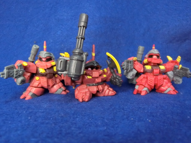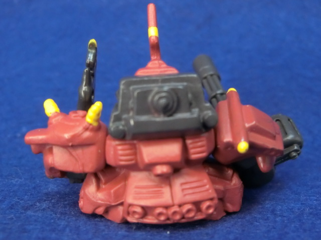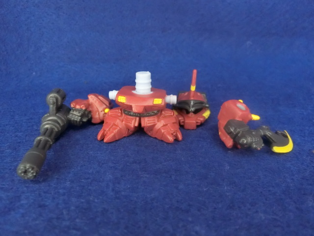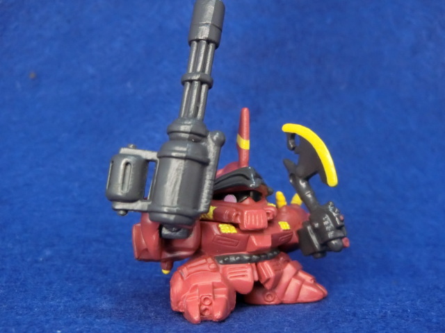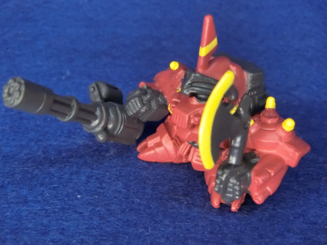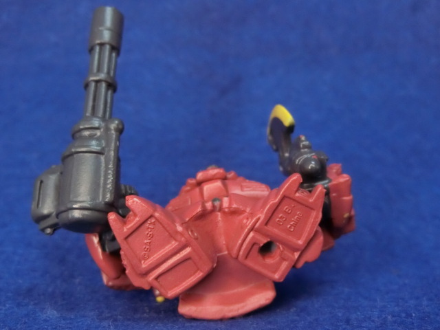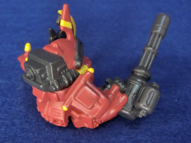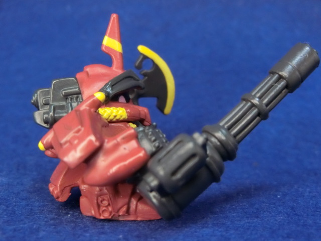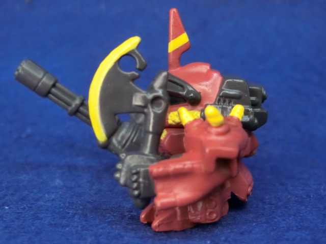 マシンガン2丁を構えたキメコレやフルカラー版と違い、ガトリングとヒートホークを持った状態で登場。各所トゲやパイプ等の黄色も厚ぼったいながら塗装されておりいい感じです。